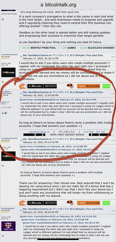 Encontrei algo interessante que acho que o sandboxcasino deveria investigar. Eles postaram no fórum bitcointalk que várias contas estão bem, a menos que sejam usadas para abuso de bônus. É claro que nunca aceitei um bônus, que depositei milhares de dólares e fiz apostas máximas. Tenho certeza de que essas 6 outras contas com o mesmo endereço IP VPN usaram bônus e jogaram o mínimo absolutamente necessário para tentar ganhar alguns dólares.